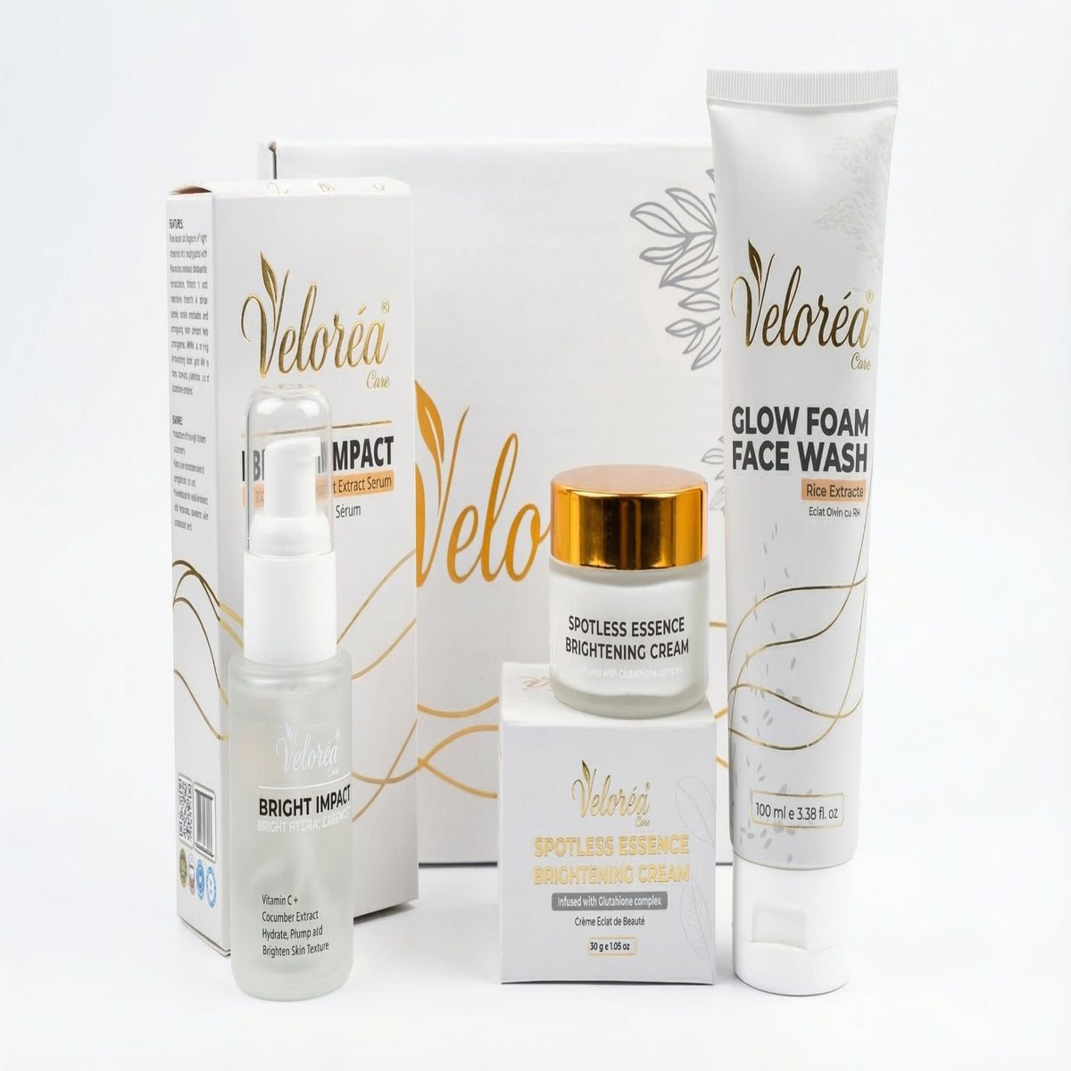 Discover Veloréa Care's comprehensive skincare bundle combining our bestselling Glow Foam Face Wash, Bright Impact Vitamin C Serum, and Spotless Essence Brightening Cream. This complete three-step system is scientifically formulated to cleanse, brighten, and nourish your skin with visible results in just 2 weeks. Get everything you need for radiant, spotless, glowing skin in one affordable bundle.